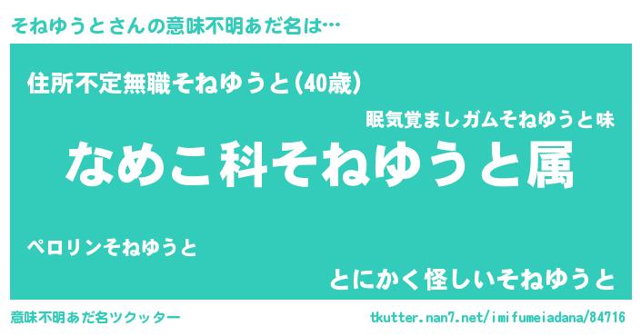 | 男性向けラノベタイトル風あだ名 | 『転生したらそねゆうとだった件』 |