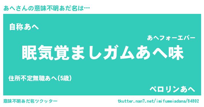 | ヒーロー風カッコイイあだ名 | 『慈愛の使者あへ』『最強戦士アヘ』 |