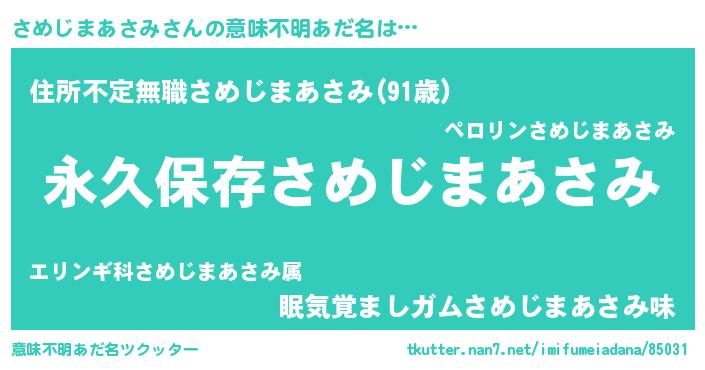 | 男性向けラノベタイトル風あだ名 | 『さめじまあさみという概念が存在しない退屈な世界 』 |