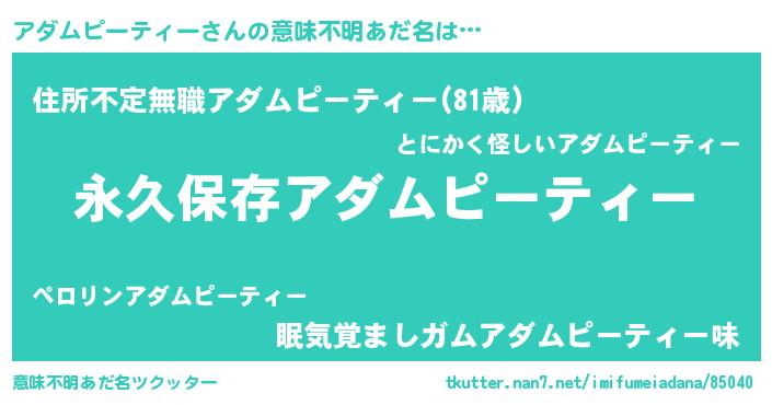 | 男性向けラノベタイトル風あだ名 | 『アダムピーティーという概念が存在しない退屈な世界 』 |