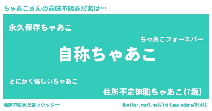| 男性向けラノベタイトル風あだ名 | 『Re:ちゃあこから始める異世界生活』 |