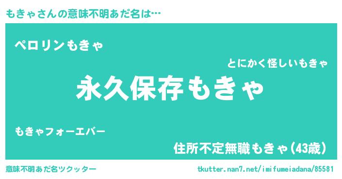 | 男性向けラノベタイトル風あだ名 | 『うちのもきゃが世界を掌握している!』 |
