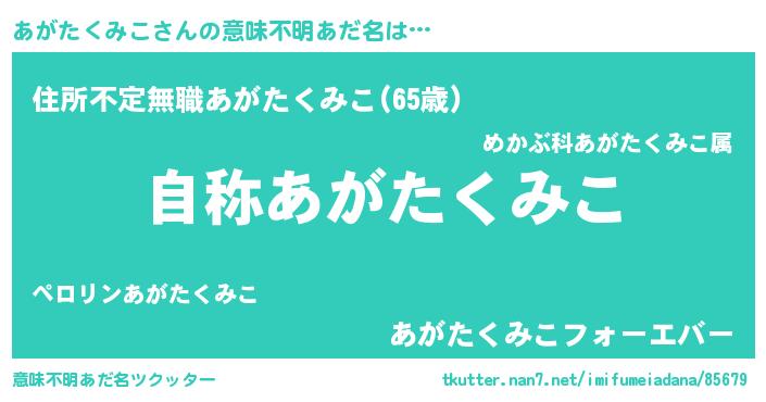 | 男性向けラノベタイトル風あだ名 | 『Re:あがたくみこから始める異世界生活』 |