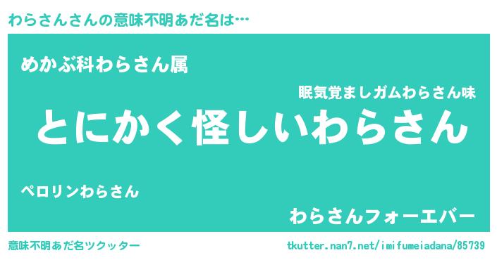 | 男性向けラノベタイトル風あだ名 | 『わらさんの嫁は女の子じゃないと思った?』 |