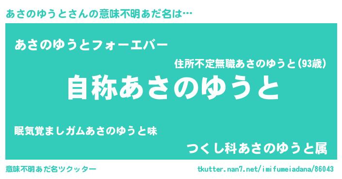 | 男性向けラノベタイトル風あだ名 | 『Re:あさのゆうとから始める異世界生活』 |