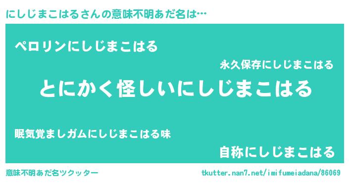 | 女子向けラノベタイトル風あだ名 | 『にしじまこはるの卵を拾いまして』 |