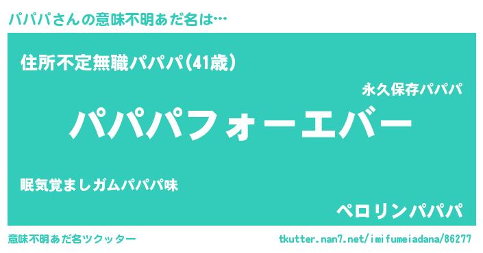 | 男性向けラノベタイトル風あだ名 | 『うちの娘の為ならば、俺はもしかしたらパパパも倒せるかもしれない。』 |