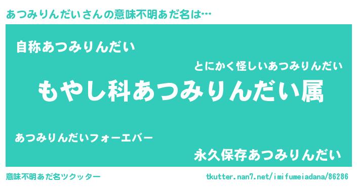| 男性向けラノベタイトル風あだ名 | 『転生したらあつみりんだいだった件』 |