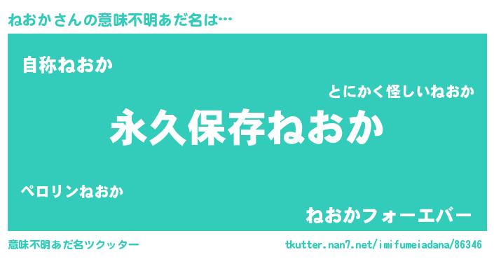 | 男性向けラノベタイトル風あだ名 | 『ねおかという概念が存在しない退屈な世界 』 |