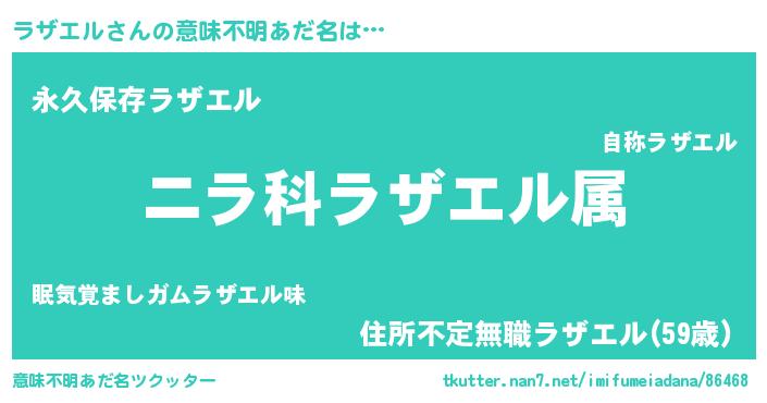 | 男性向けラノベタイトル風あだ名 | 『ラザエル~年齢イコール彼女いない歴の魔法使い~』 |