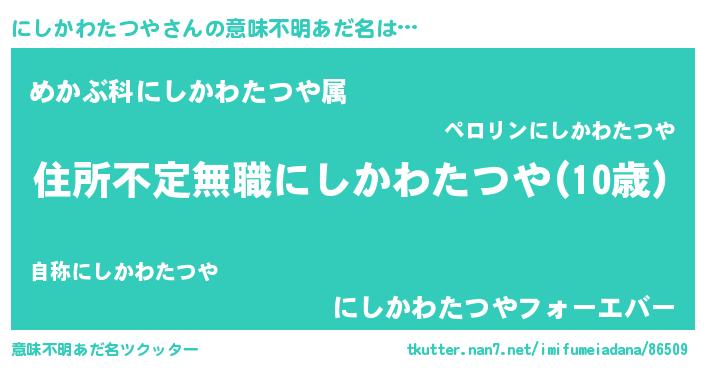 | 女子向けラノベタイトル風あだ名 | 『にしかわたつやが死なない童話 林檎のにしかわたつやの診療簿』 |