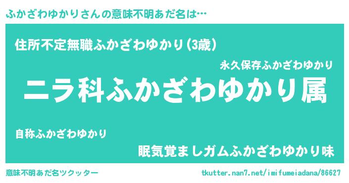| ヘコむあだ名 | 『ふかざわゆかり(遠い目)』『ふかにー』 |
