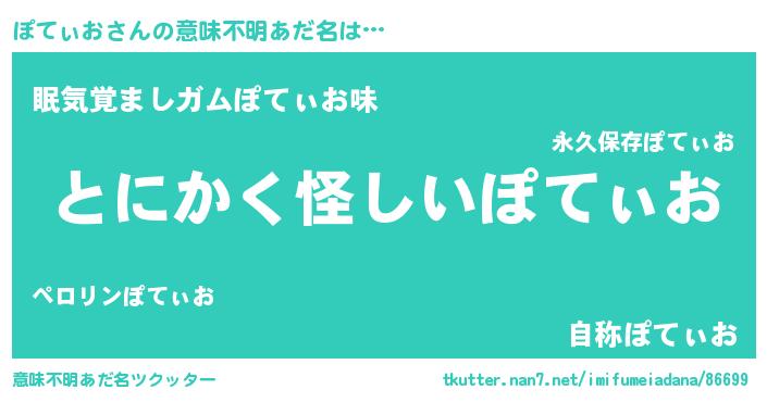 | 胡散臭い通販商品みたいなあだ名 | 『信頼と実績のサプリメント…その名も「ぽてぃお」』 |