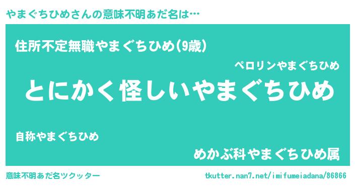 | 男性向けラノベタイトル風あだ名 | 『やまぐちひめの嫁は女の子じゃないと思った?』 |