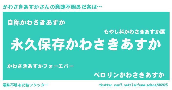 | 男性向けラノベタイトル風あだ名 | 『かわさきあすかという概念が存在しない退屈な世界 』 |