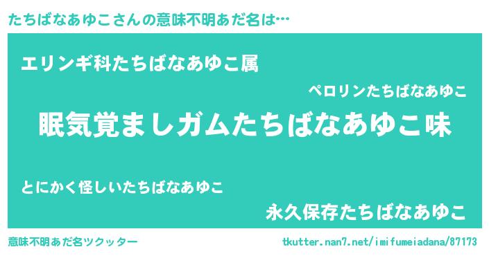 | 男性向けラノベタイトル風あだ名 | 『おまえをオタクにしてやるから、俺をたちばなあゆこにしてくれ! 』 |