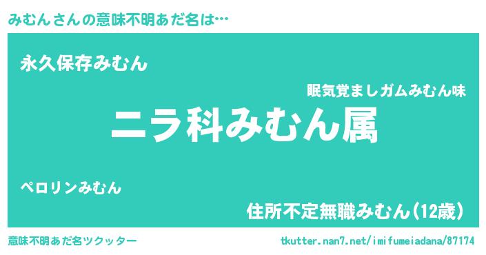 | 男性向けラノベタイトル風あだ名 | 『みむん~年齢イコール彼女いない歴の魔法使い~』 |