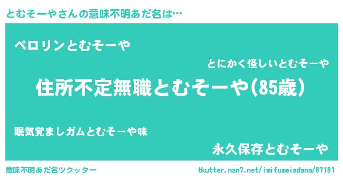 | 欧米人風あだ名 | 『とむそーや・ステッグマイヤー』 |