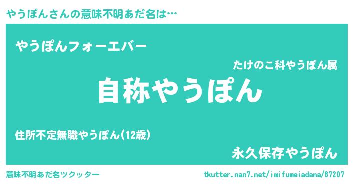 | 男性向けラノベタイトル風あだ名 | 『やうぽんに滅ぼされるだけの簡単なお仕事です』 |