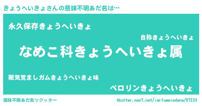 | 男性向けラノベタイトル風あだ名 | 『転生したらきょうへいきょだった件』 |