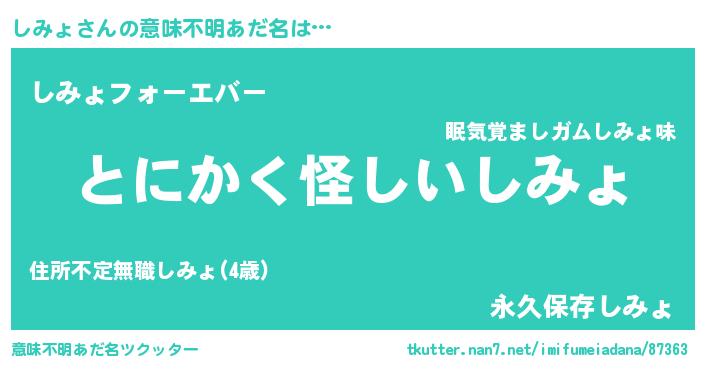 | 胡散臭い通販商品みたいなあだ名 | 『信頼と実績のサプリメント…その名も「しみょ」』 |