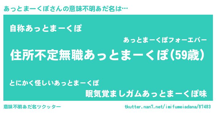| 男性向けラノベタイトル風あだ名 | 『魔弾の王とあっとまーくぽ』 |