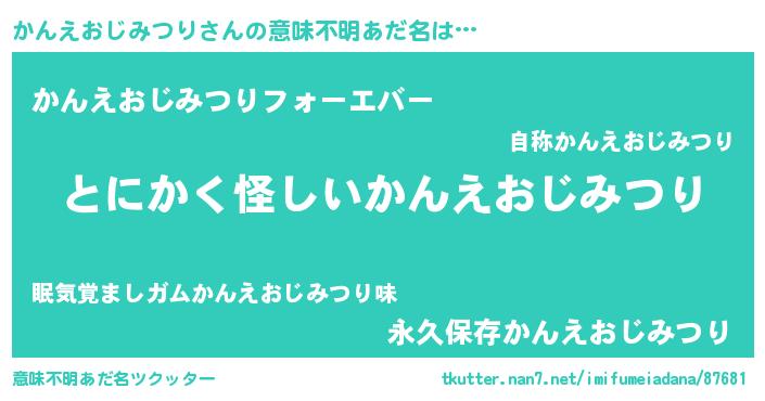 | 男性向けラノベタイトル風あだ名 | 『かんえおじみつりの嫁は女の子じゃないと思った?』 |