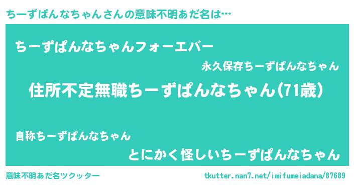 | 男性向けラノベタイトル風あだ名 | 『この素晴らしい世界にちーずぱんなちゃんを!』 |