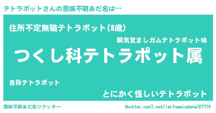 | 男性向けラノベタイトル風あだ名 | 『テトラポット~年齢イコール彼女いない歴の魔法使い~』 |