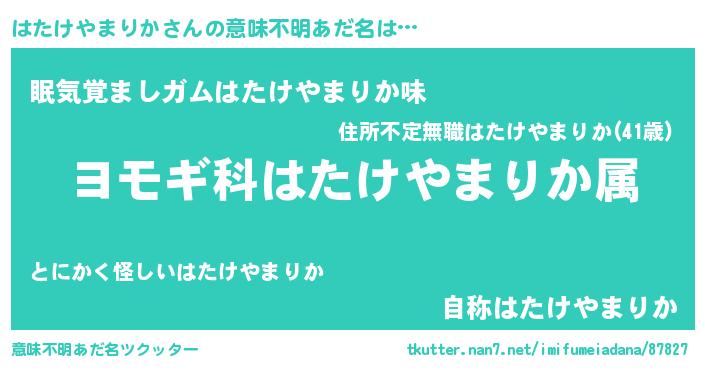 | 男性向けラノベタイトル風あだ名 | 『はたけやまりか~年齢イコール彼女いない歴の魔法使い~』 |