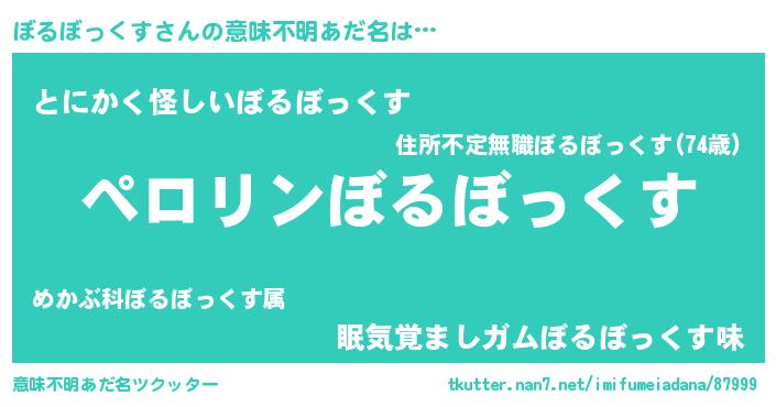 | 男性向けラノベタイトル風あだ名 | 『ぼるぼっくすの憂鬱』 |