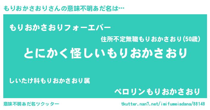 | 男性向けラノベタイトル風あだ名 | 『もりおかさおりの嫁は女の子じゃないと思った?』 |