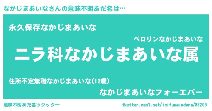 | 男性向けラノベタイトル風あだ名 | 『なかじまあいな~年齢イコール彼女いない歴の魔法使い~』 |