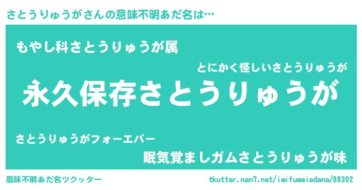 | 胡散臭い通販商品みたいなあだ名 | 『絶対に幸福をもたらす水素水…その名も「さとうりゅうが」』 |