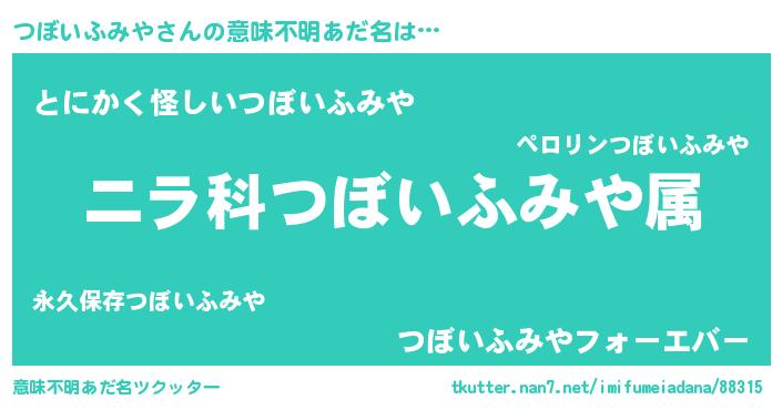 | 男性向けラノベタイトル風あだ名 | 『つぼいふみや~年齢イコール彼女いない歴の魔法使い~』 |