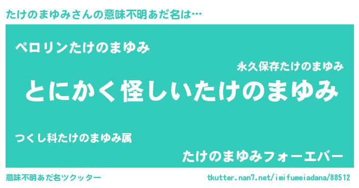 | 男性向けラノベタイトル風あだ名 | 『うちのたけのまゆみが世界を掌握している!』 |