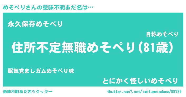 | ヘコむあだ名 | 『めそぺり(震え声)』『めそぷりん』 |