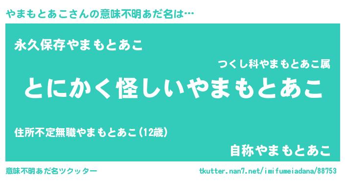 | 男性向けラノベタイトル風あだ名 | 『やまもとあこの嫁は女の子じゃないと思った?』 |
