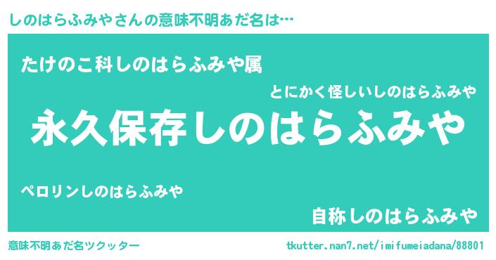 | 男性向けラノベタイトル風あだ名 | 『しのはらふみやという概念が存在しない退屈な世界 』 |