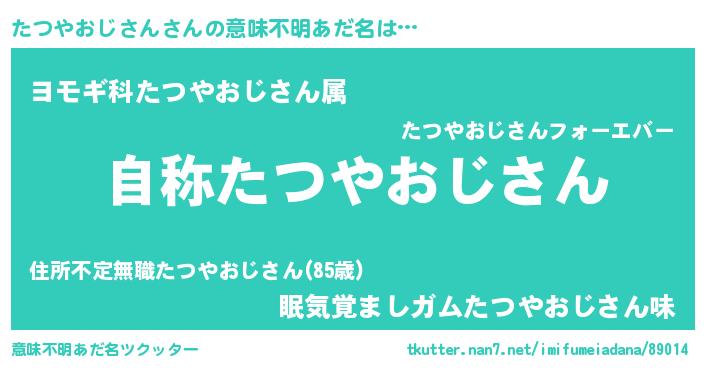 | 男性向けラノベタイトル風あだ名 | 『たつやおじさんに滅ぼされるだけの簡単なお仕事です』 |