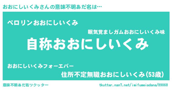 | 男性向けラノベタイトル風あだ名 | 『おおにしいくみに滅ぼされるだけの簡単なお仕事です』 |