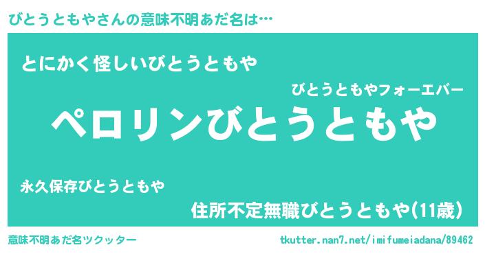 | 男性向けラノベタイトル風あだ名 | 『ビトウトモヤアートオンライン』 |