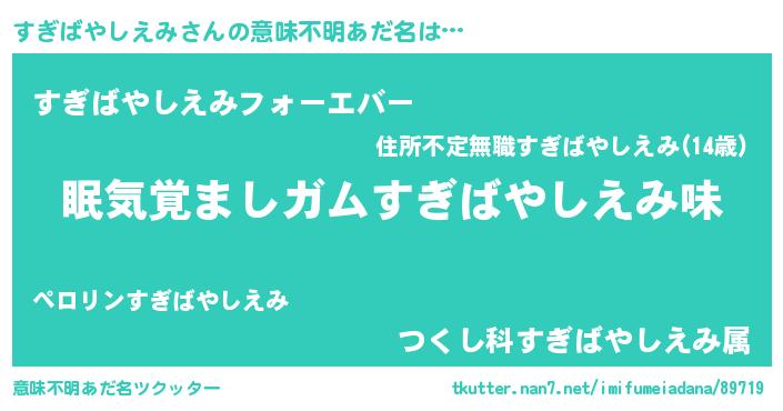 | 男性向けラノベタイトル風あだ名 | 『おまえをオタクにしてやるから、俺をすぎばやしえみにしてくれ! 』 |