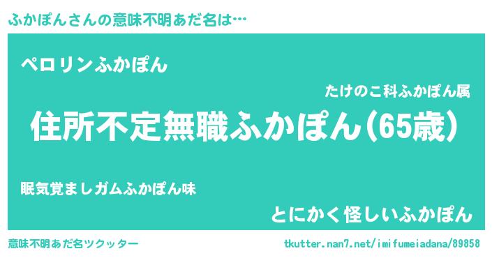 | 男性向けラノベタイトル風あだ名 | 『魔弾の王とふかぽん』『ふかぽんの憂鬱』 |