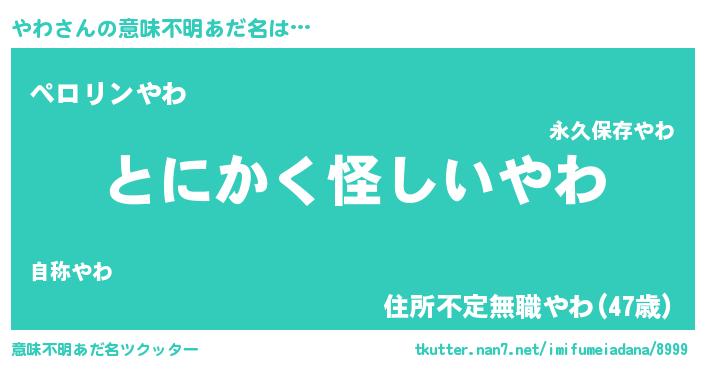 | 胡散臭い通販商品みたいなあだ名 | 『信頼と実績のサプリメント…その名も「やわ」』 |