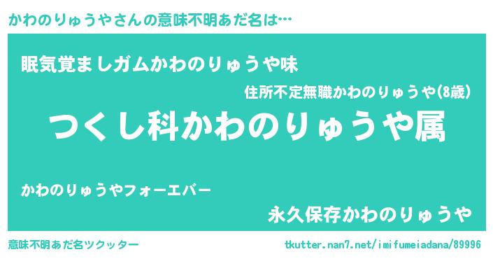 | 男性向けラノベタイトル風あだ名 | 『かわのりゅうや~年齢イコール彼女いない歴の魔法使い~』 |