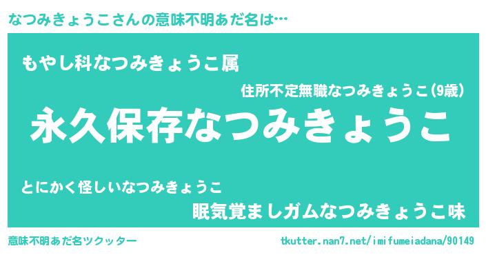 | 女子向けラノベタイトル風あだ名 | 『異世界で失敗しない100のなつみきょうこ』 |