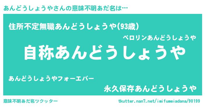 | 男性向けラノベタイトル風あだ名 | 『Re:あんどうしょうやから始める異世界生活』 |