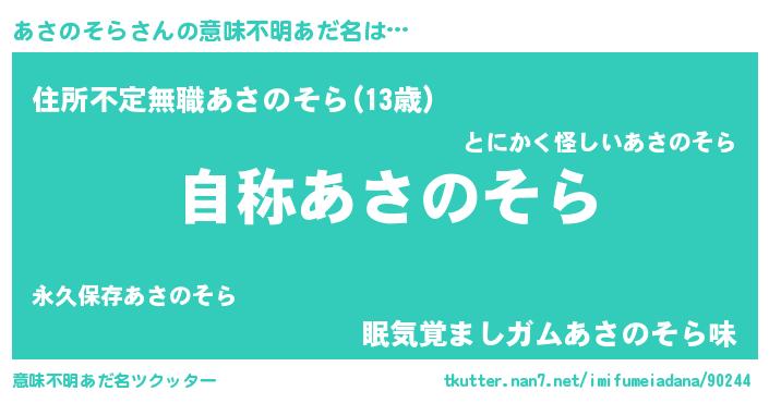 | 男性向けラノベタイトル風あだ名 | 『あさのそらに滅ぼされるだけの簡単なお仕事です』 |
