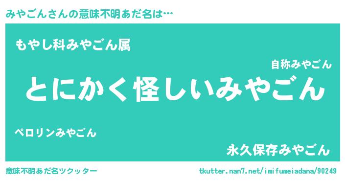 | 男性向けラノベタイトル風あだ名 | 『ダンジョンにみやごんを求めるのは間違っているだろうか』 |